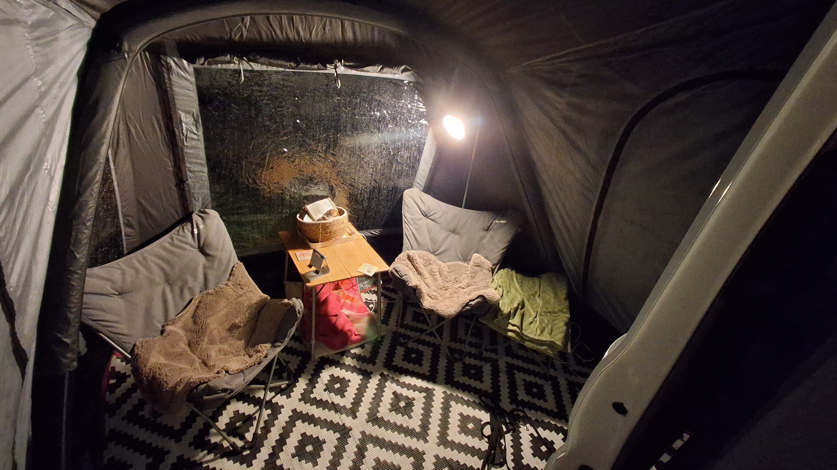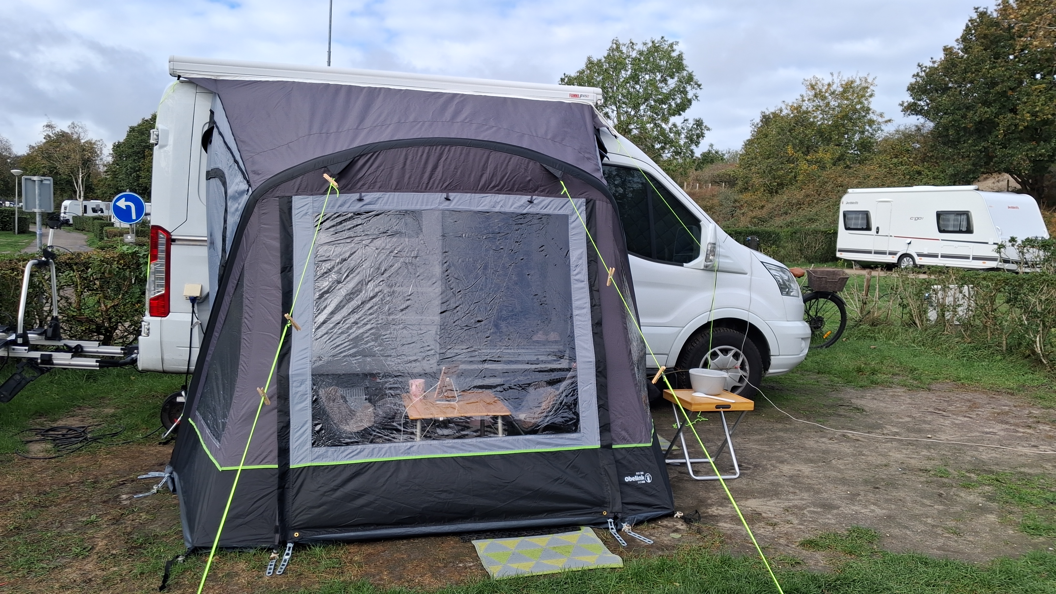 Deze tent, voortent of luifel is voorzien van opblaasbare luchtslangen i.p.v. tentstokken.
