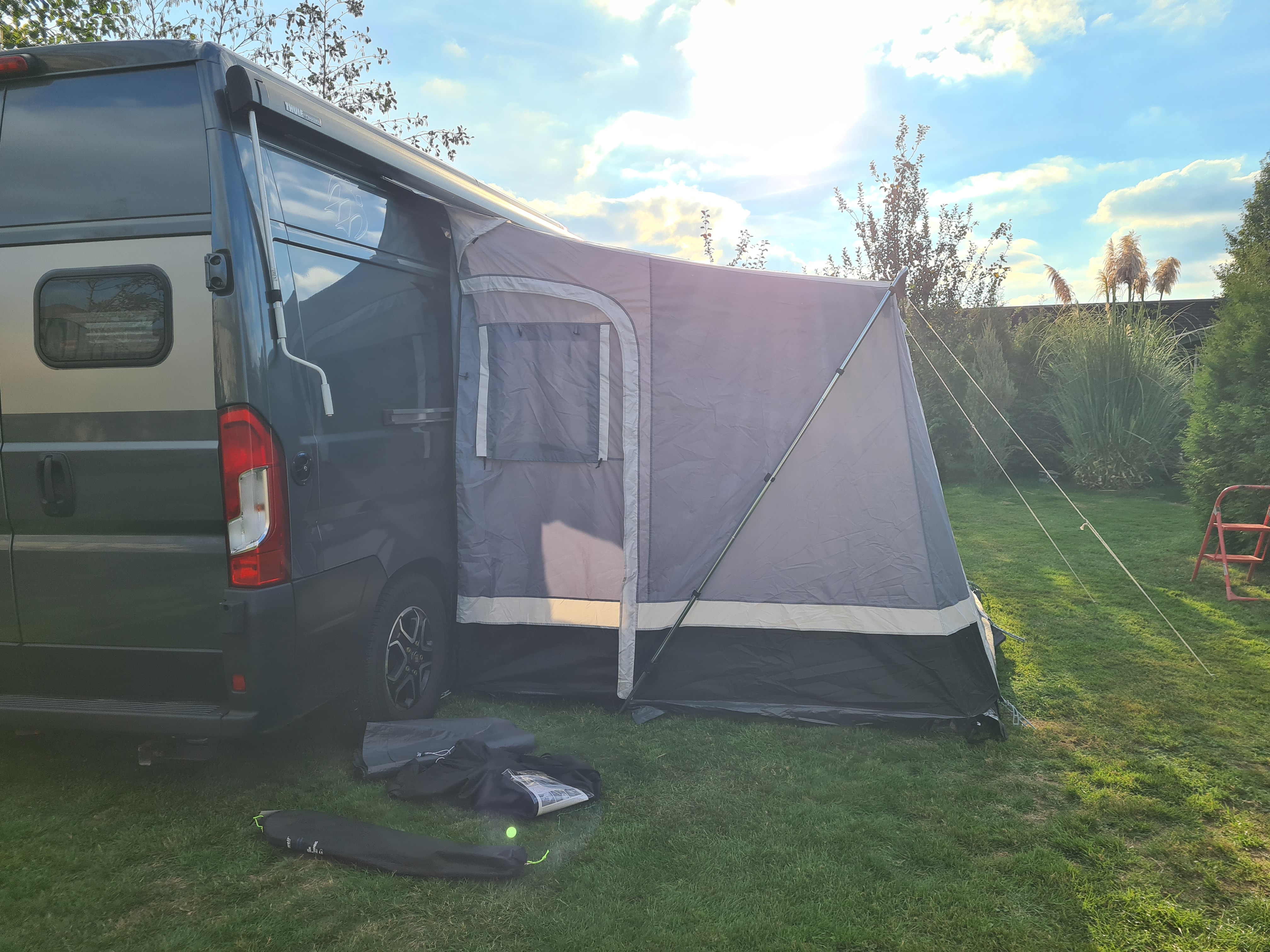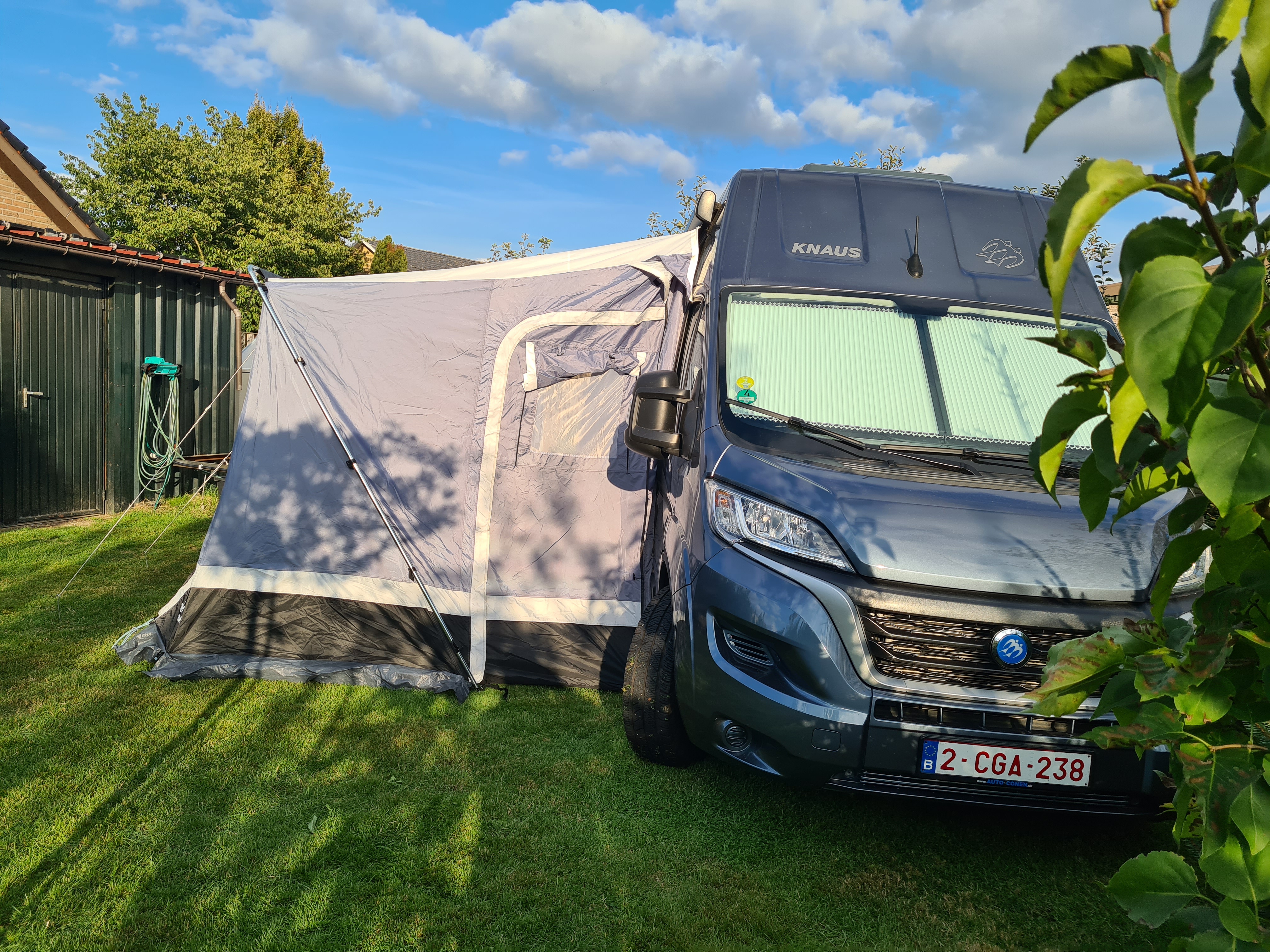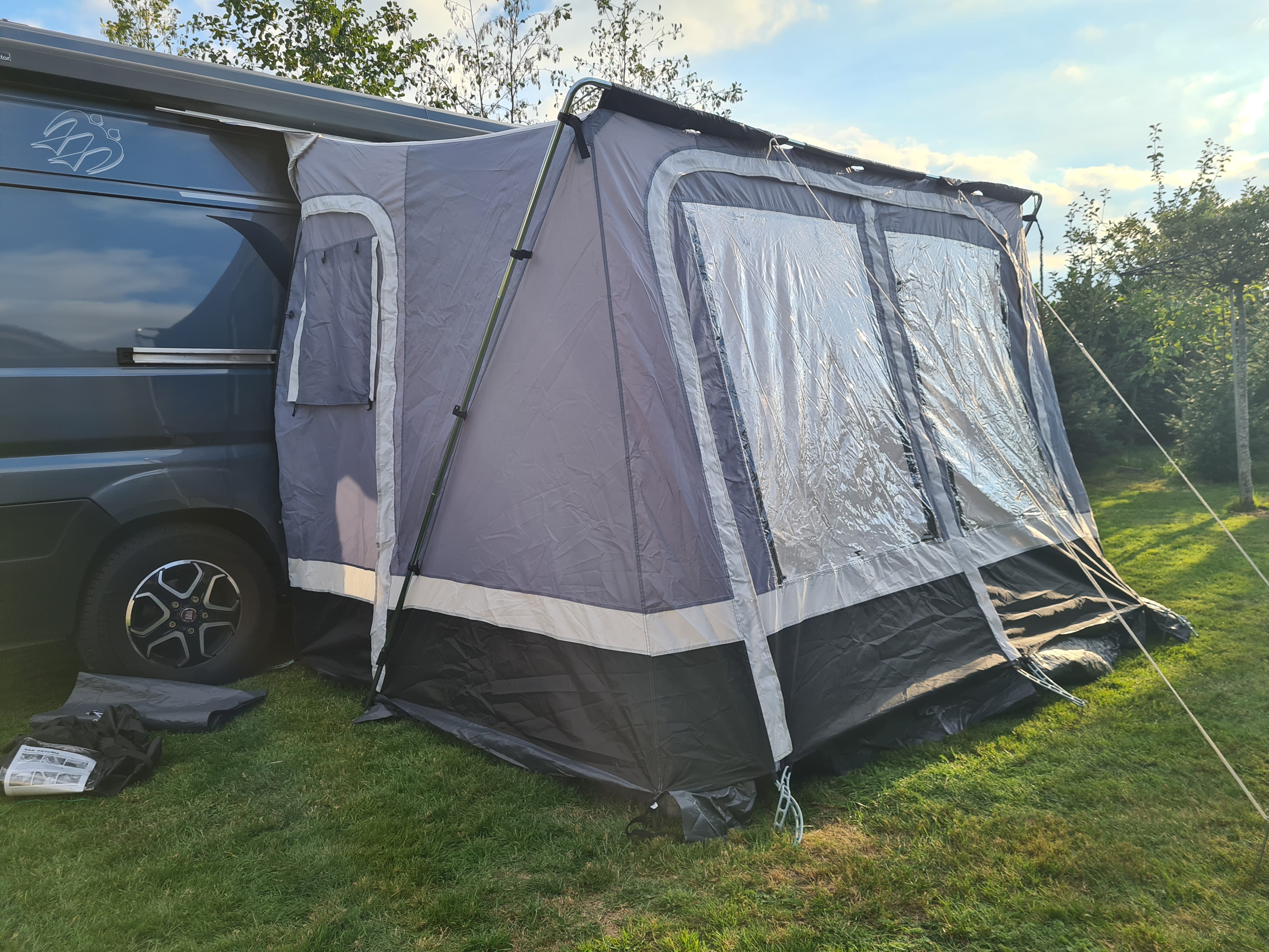 Deze tent, voortent of luifel is voorzien van opblaasbare luchtslangen i.p.v. tentstokken.