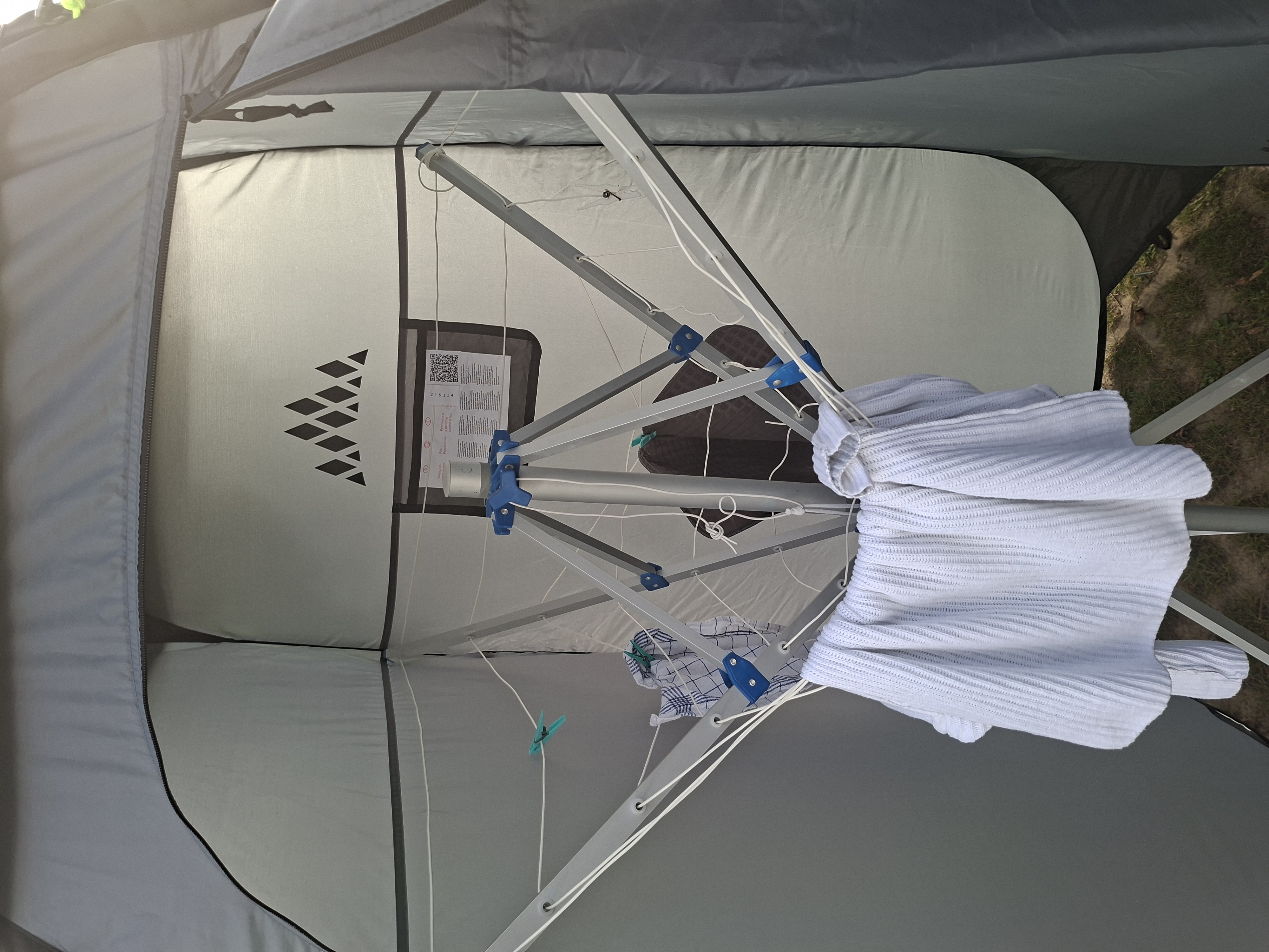 Deze tent, voortent of luifel is voorzien van opblaasbare luchtslangen i.p.v. tentstokken.