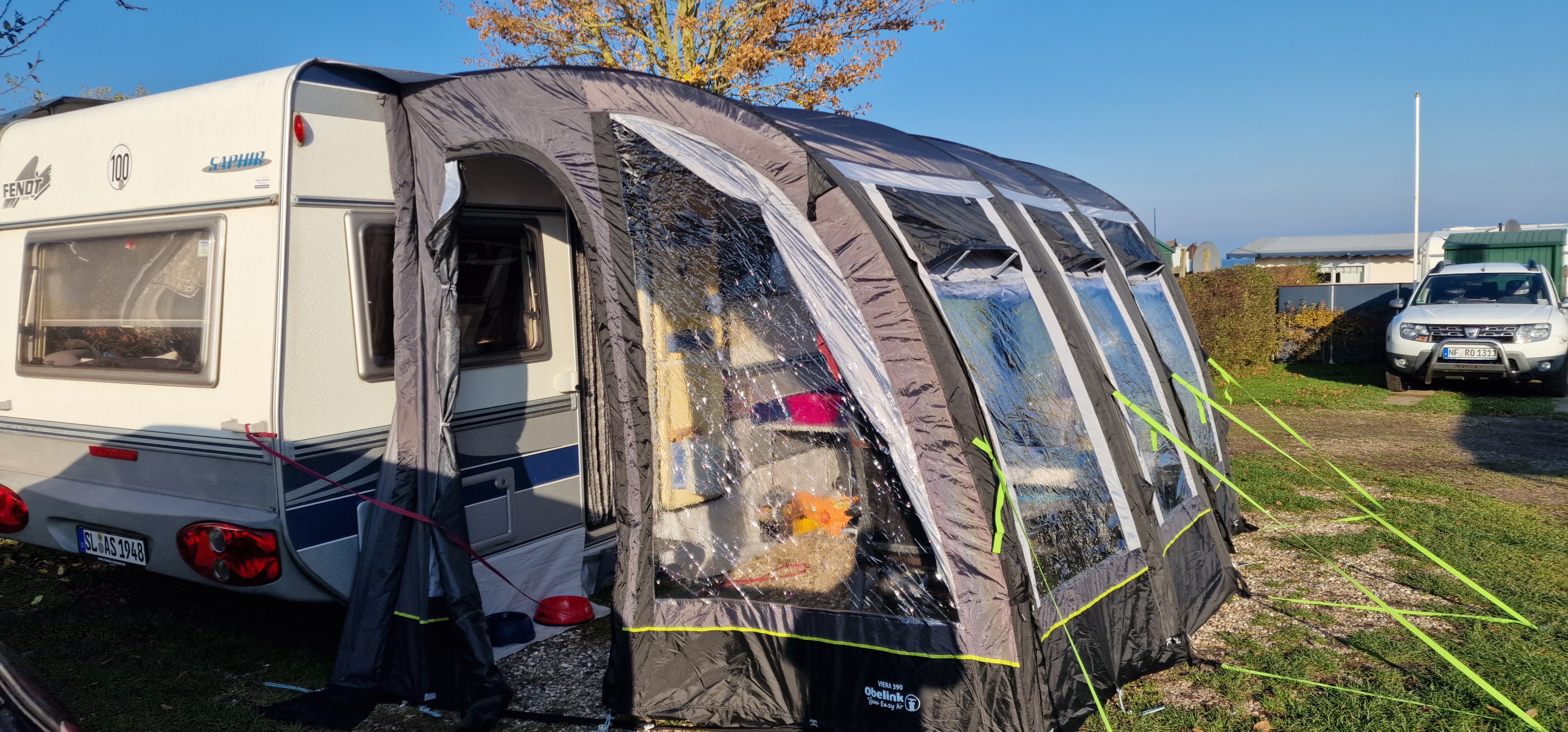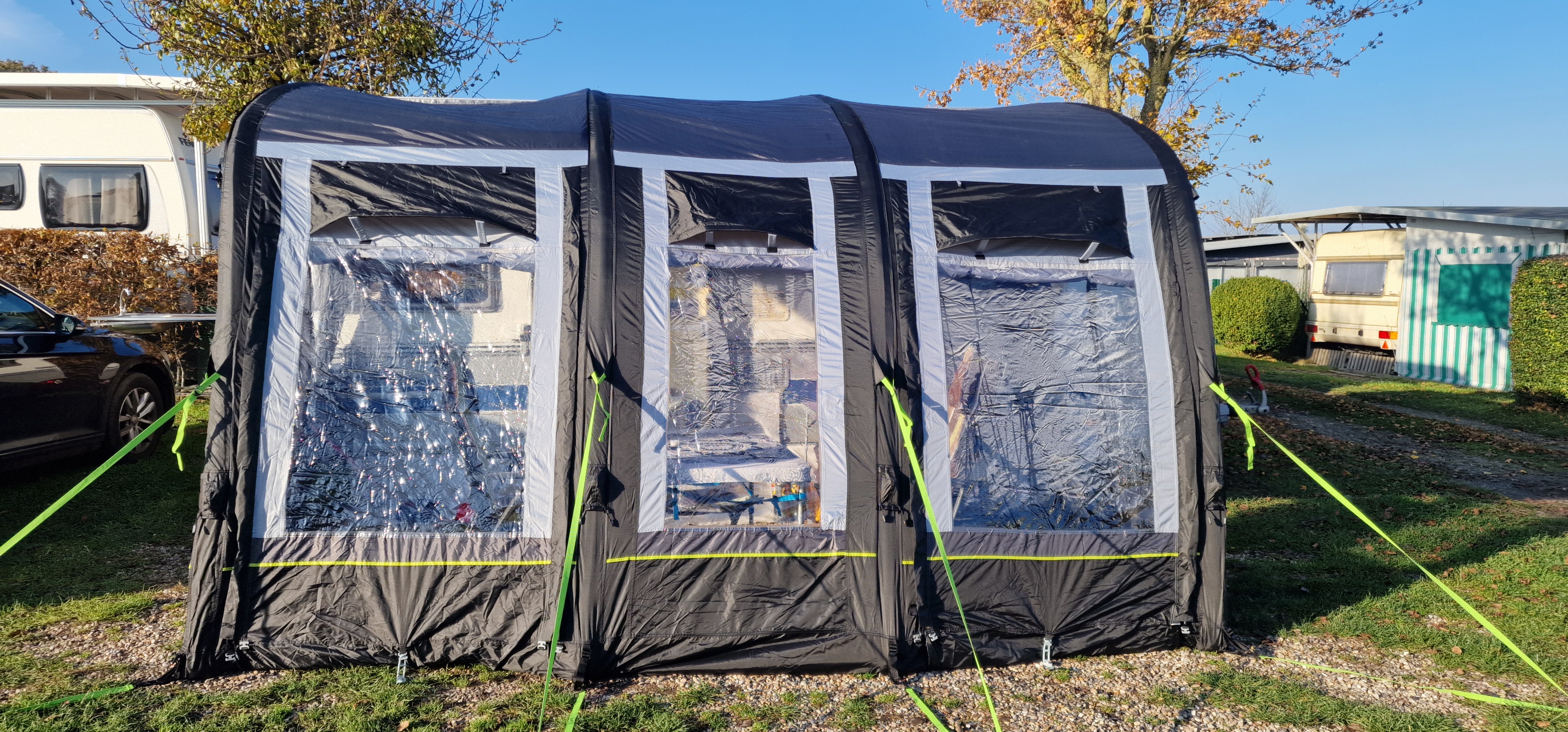 Deze tent, voortent of luifel is voorzien van opblaasbare luchtslangen i.p.v. tentstokken.