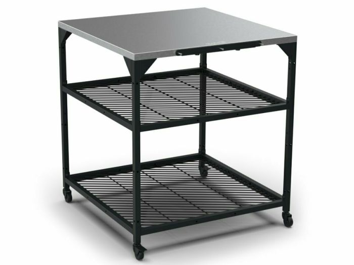 Het robuuste werkblad van roestvrij staal (RVS) biedt een stevig en hygiënisch oppervlak, ideaal voor het bereiden en afwerken van pizza’s. Het frame is gemaakt van gepoedercoat staal, wat de tafel niet alleen duurzaam maakt, maar ook zorgt voor een moderne uitstraling die goed past in elke buitenkeuken.
