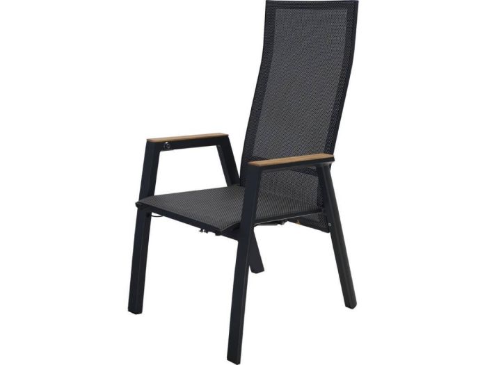 De stoel heeft een afmeting van 70 x 59.5 x 112 cm met een zithoogte van 45 centimeter. Het frame is gemaakt van aluminium in een matte antraciet kleur en in de armleuningen zit teakhout verwerkt. De zitting is gemaakt van weerbestendig textileen en het verstelmechanisme werkt door middel van een gasveer.