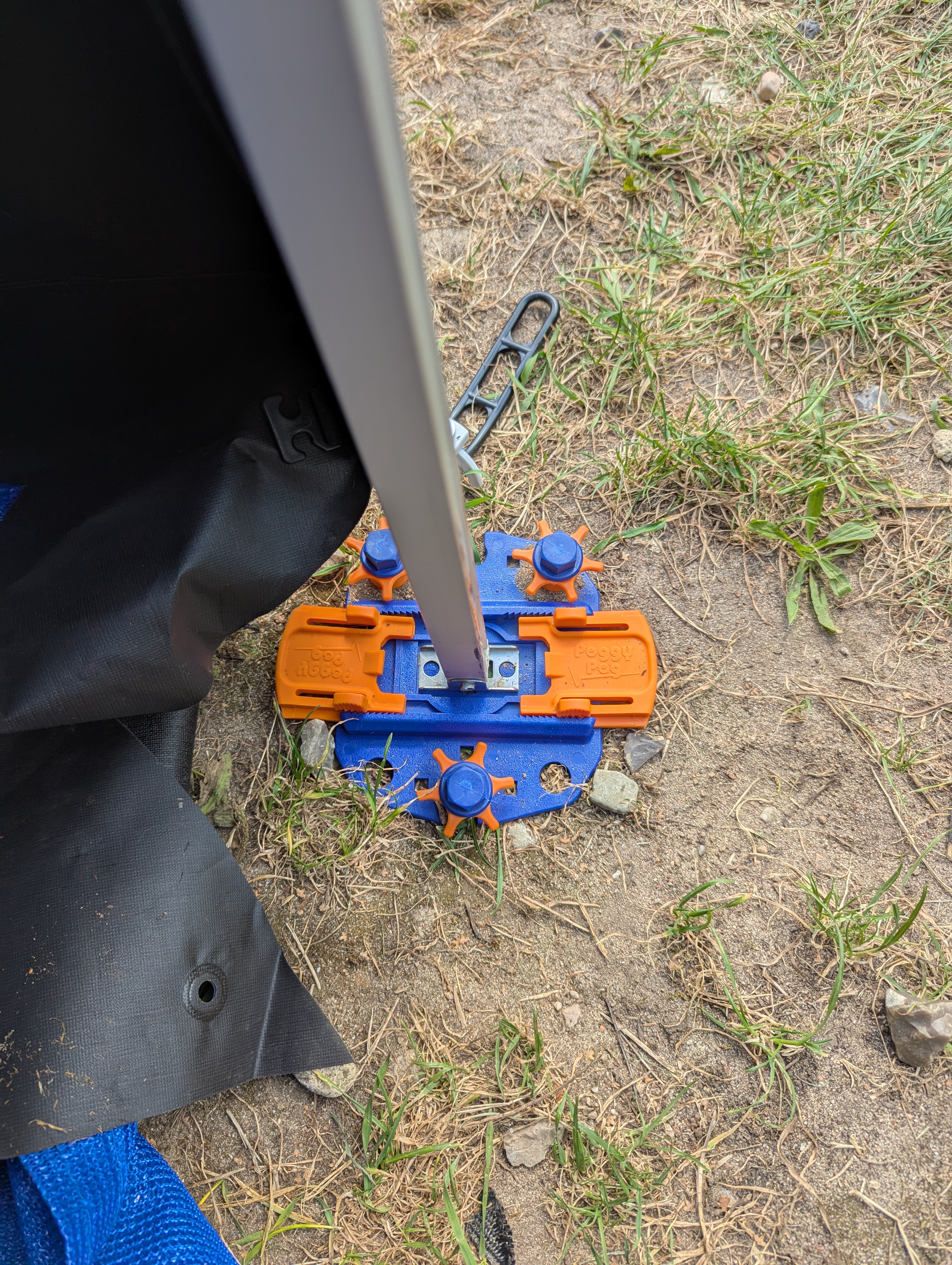 Met de handige meegeleverde Kombi Tool kan je de haringen met de hand aandraaien, of met je accuboormachine. Mocht je je luifel snel weer in willen rollen, dan hoef je alleen maar de oranje schuifjes van de ankerplaten te openen.