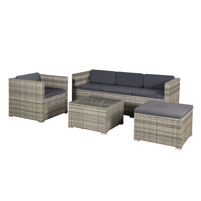 Ben je op zoek naar een comfortabele en grote loungeset voor in je tuin, terras of balkon? Met de zitset "Punta Cana L" verander je je buitenruimte in een stijlvolle plek om te ontspannen en je goed te voelen. Gezellige avonden met familie, vrienden of buren worden een belevenis in de buitenlucht. De unieke rotan look in grijs-beige met grijze vulling geeft je nieuwe loungemeubel een moderne charme. Creëer je eigen oase van welzijn om te ontspannen en samen te zitten.