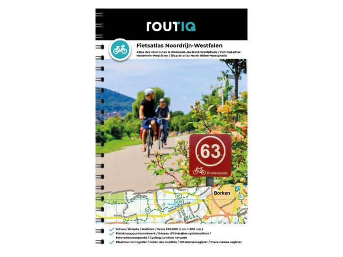 De Routiq Noordrijn-Westfalen fietsatlas bevat 244 pagina's met cartografie van Noordrijn-Westfalen aangevuld met het knooppuntennetwerk.