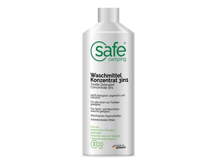 SAFE CAMPING Wasmiddelconcentraat 3in1 is een textielwasmiddel voor zowel machinewas als handwas.