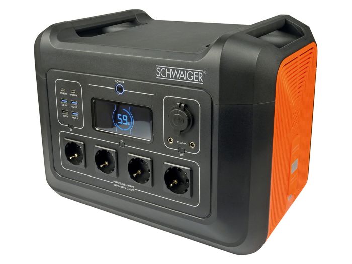 De draagbare krachtcentrale van SCHWAIGER® wordt gebruikt voor de mobiele stroomvoorziening van elektrische apparaten. Hiervoor wordt een uiterst krachtige en duurzame lithium-ijzerfosfaatbatterij geïnstalleerd. Deze kan worden opgeladen met behulp van een zonnepaneel, de sigarettenaansteker in de auto of met behulp van een wisselstroomadapter aan een standaard Schuko-stopcontact. Onderweg kun je gemakkelijk je smartphone en laptop of zelfs koelers en elektrisch gereedschap van stroom voorzien. Een geavanceerd multi-beveiligingssysteem zorgt altijd voor de nodige veiligheid.