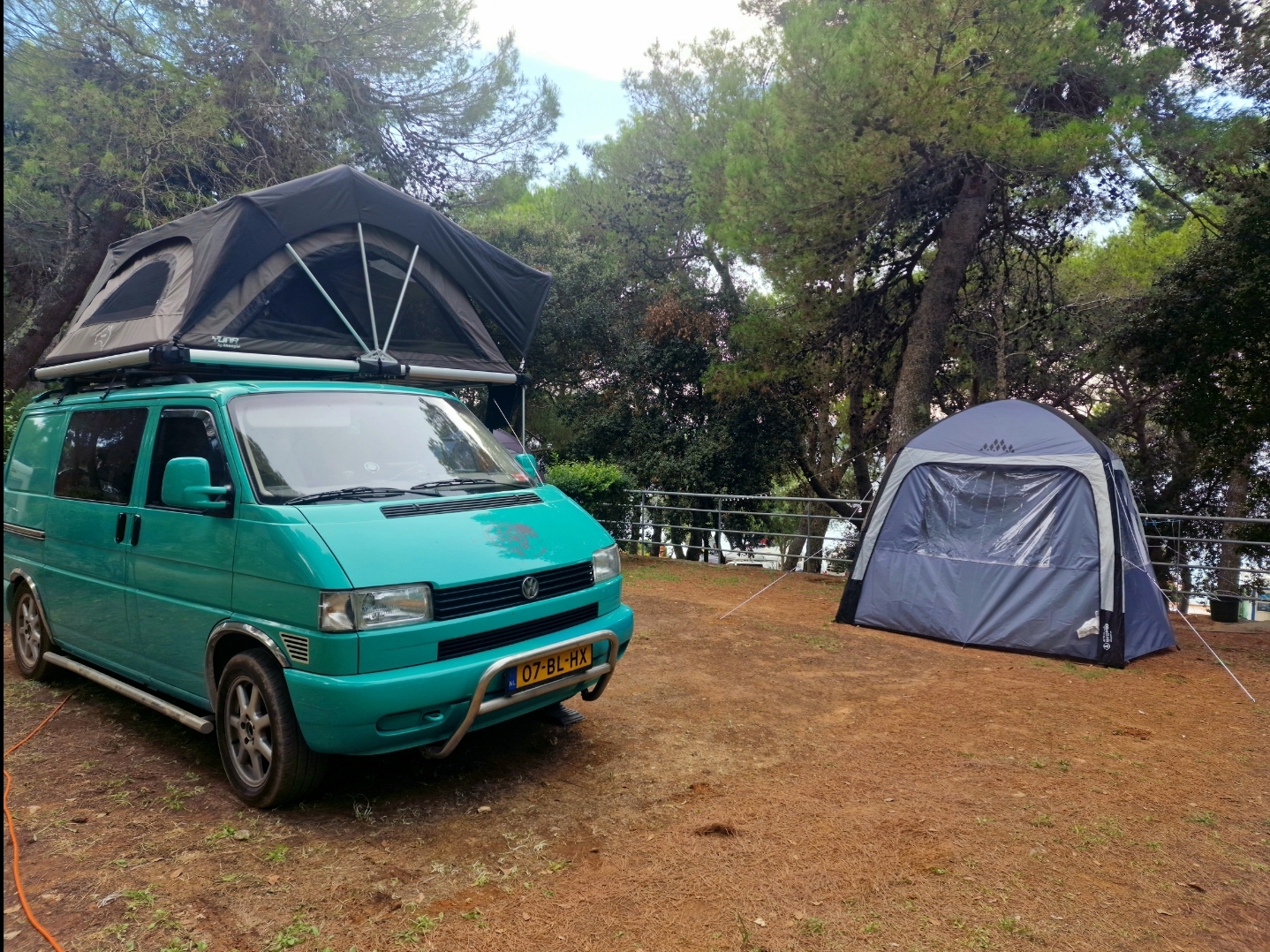 Dit is de linker zijwand wanneer je met je gezicht naar de tent toe staat.
