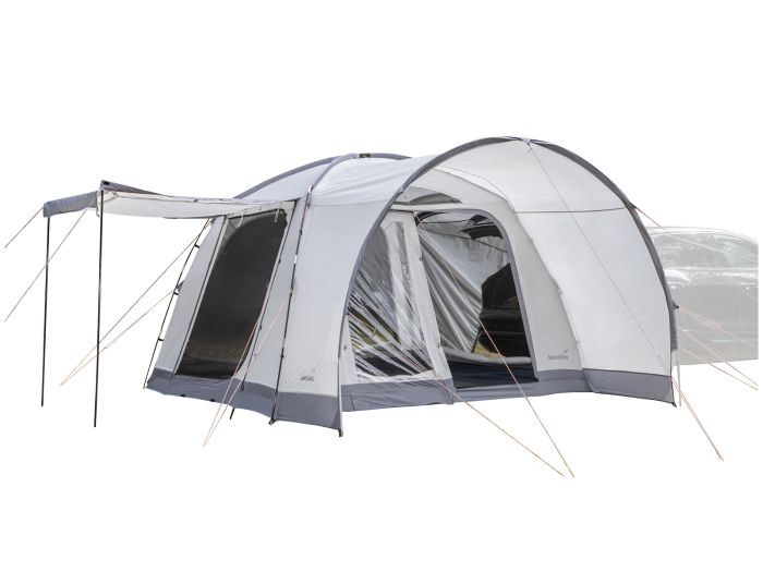 De doordachte koepeltent met één laag voor maximaal vier personen overtuigt al als vrijstaande tent met grote panoramavensters een slimme multifunctionele deur onder een vast geïntegreerde luifel met zijwanden en een zij-ingang die kan worden omgevormd tot een zonnescherm. De sluis wordt met stevige ritsen aan de tent bevestigd zodat een perfect passende voortent ontstaat. De scheerlijnen kunnen eenvoudig en zonder gereedschap aan het voertuig worden bevestigd – zonder speciale accessoires. De sluis biedt directe beschermde toegang tot het voertuig bij de geopende schuifdeur en is geschikt voor de meeste gangbare bestelwagen- en minibusmodellen.