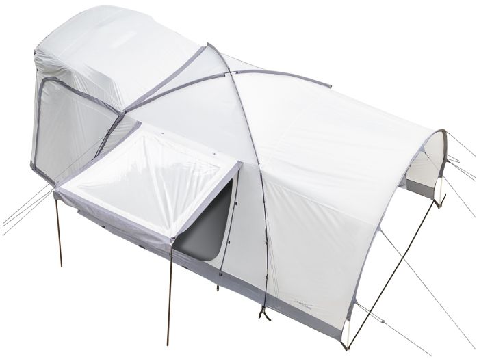 Er kan een optionele uitbouw aan de tent geplaatst worden om de tent te vergroten.