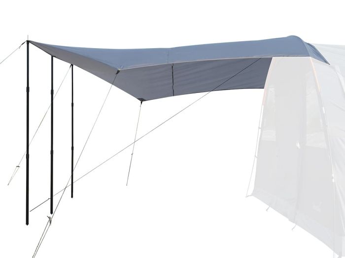 Door zijn speciale vorm past hij perfect bij de ingang van veel tentmodellen. De achterrand wordt eenvoudig over de tent gelegd en naar achteren gespannen. De drie meegeleverde telescopische stangen, die traploos verstelbaar zijn (tot 210 cm hoogte), ondersteunen de voorrand en creëren een ruime luifel.