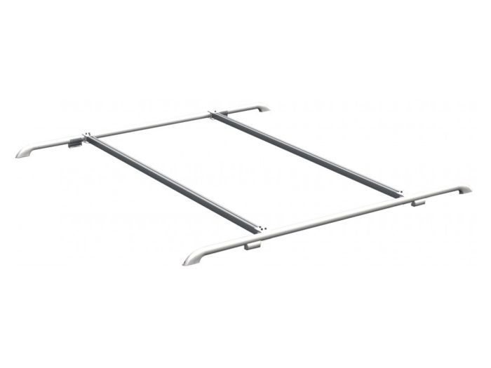 Dakrail met ovalen profielen. Makkelijk in te korten. Uiteinden en steunen afgewerkt met kunststof stukken. Set van 2 stuks. Optie: dwarsrails 75.088.70.
