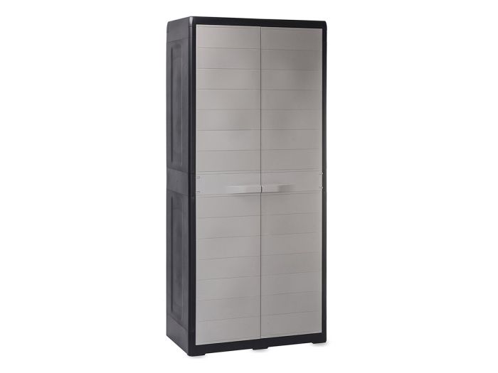 Toomax Elegance XL utility opbergkast hoog- lichtgrijs/antracietDe Toomax Elegance XL utility opbergkast hoogis de perfecte oplossing voor het opbergen van kussens, tuinaccessoires en andere spullen in je tuin of in je garage. Deze stijlvolle en multifunctionele opbergkast biedt een combinatie van gebruiksgemak, duurzaamheid en een aantrekkelijk ontwerp. De opbergkast beschikt over een hangslotvoorziening zodat je de box volledig kan afsluiten. (hangslot niet meegeleverd). Deze opbergkast 1 plank bovenin waar je 30kg op kan zetten. Op de andere planken mag je 15kg zetten.Makkelijk in gebruikDeToomax Elegance XL utility opbergkast hoogis gemakkelijk in elkaar te zetten door middel van klikverbindingen. Hiervoor is geen gereedschap benodigd.KenmerkenGeschikt voor binnen (en buiten overdekt)SpatwaterdichtAfmetingen 78 (breedte) x 46 (diepte) x 175 (hoogte) cmAfmeting binnenmaat 77 (breedte) x 38,5 (diepte) x 161,5 (hoogte) cmMaximaal draaggewicht per plank: 30 en 15 kgKan worden vastgemaakt aan de muurKan op slot worden gedaan