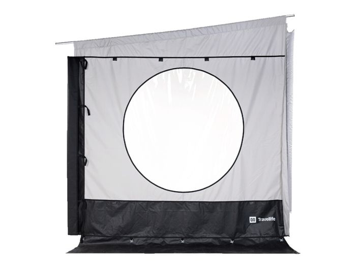 Creëer een beschut plekje voor jouw kampeervoertuig met de Scala zijwand. Het doek is gemaakt van dubbel gecoate polyester stof en daardoor water- en uv-bestendig. Deze zijwand is geschikt voor Thule, Fiamma en Dometic cassetteluifels met een uitval van 2,50 m. Hij past op voertuigen met een luifel aanbouwhoogte van 2,65 tot 2,84 m. Dit is de afstand van de onderkant van de gesloten cassette tot aan de grond. De zijwand beschikt over ronde ramen met meegeleverde blindering. Hierdoor kun je nog steeds van je omgeving genieten, maar ben je wel beschermd tegen diverse weersinvloeden. Door middel van magneten kun je de blindering bevestigen. Wil je het complete voortent gevoel creëren? Combineer dan de Scala zijwand met de voorwanden en deur.