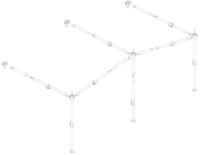 Het frame is voorzien van 3 staanders en 3 dakliggers. Met de meegeleverde F-links kun je het luifelframe aan het voortentframe van je Isabella of Ventura voortent koppelen.