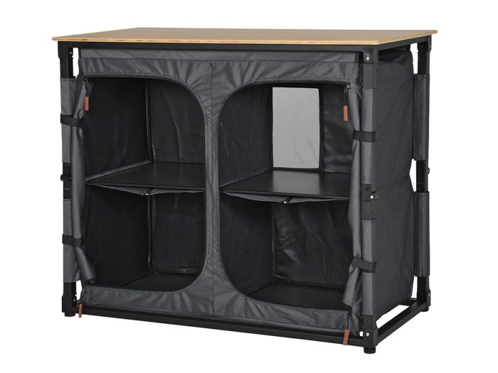 De Obelink Bamboo Quick - Black heeft vier ruime opbergvakken waarin je jouw kampeeruitrusting overzichtelijk kunt opbergen. De achterzijde is voorzien van mesh gaas dat ervoor zorgt dat de kast goed geventileerd wordt. De kast heeft een aluminium frame en een bovenblad van bamboe. Bamboe is niet hittebestendig. Wil je toch koken op de kast, zorg er dan voor dat de hittebron het blad niet direct raakt.
