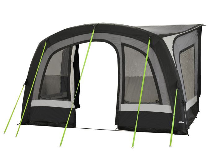 Dankzij het opblaasbare Easy Air systeem is de Casablanca 400 razendsnel op te zetten; en omdat alle luchtslangen met elkaar verbonden zijn kun je de luifel volledig oppompen via slechts één ventiel. Dankzij stevige luchtslangen in het dak en de meegeleverde fluorescerende spanbanden staat de luifel ook nog eens als een huis. Wanneer je behoefte hebt aan meer beschutting of extra privacy kun je de luifel volledig dichtmaken dankzij de meegeleverde voorwand en zijwanden die eenvoudig in te ritsen zijn. De Voorwand is voorzien van een handige deur die zijwaarts op te rollen is en ventilatieramen die voor de helft voorzien zijn van horrengaas. De zijwanden zijn voorzien van grote vensters die van binnenuit volledig af te dekken zijn.