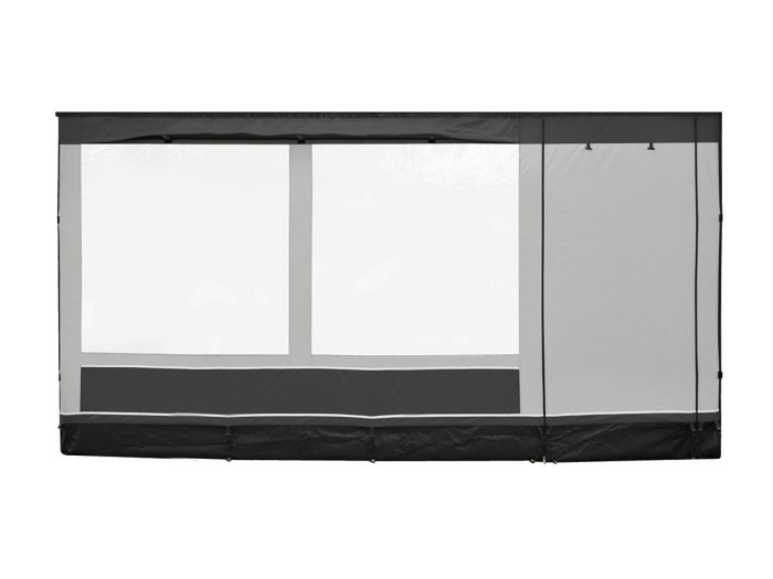 De zijkanten van de voorwand zijn voorzien van klittenbandbevestiging voor bevestiging aan de staanders van de luifel. In combinatie met de Emperor zijwanden is het mogelijk om van de luifel een complete voortent te maken.