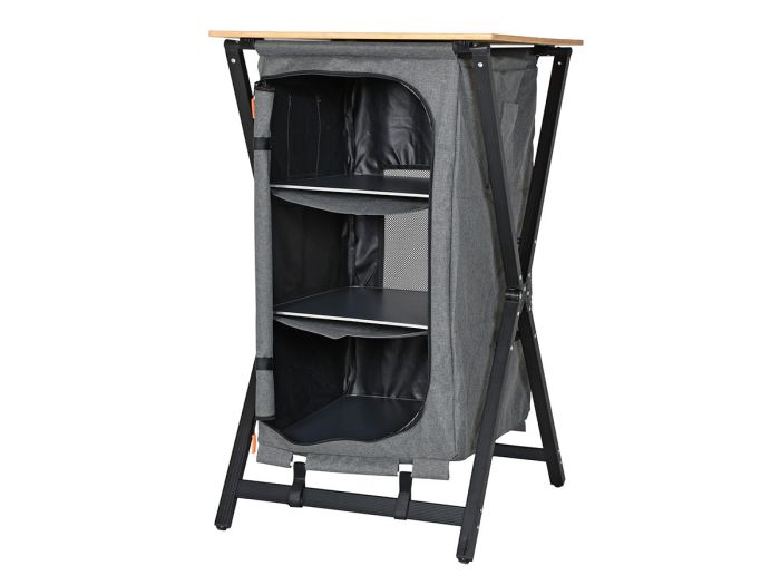 Deze kast beschikt over drie ruime opbergvakken, ideaal om kleding, kookgerei of andere kampeerspullen netjes en overzichtelijk op te bergen. Aan de zijkant vind je een handig zijvakje voor kleinere items die je snel bij de hand wilt hebben. Aan de achterkant is ventilatiegaas verwerkt, zodat je spullen fris blijven.