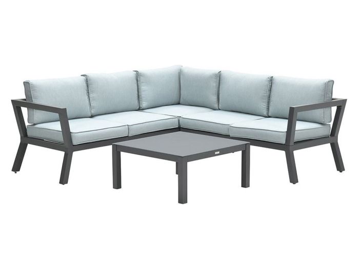 De Denver loungeset is modern vormgegeven en bestaat uit een hoekbank en een bijpassende koffietafel. Het frame is volledig vervaardigd uit aluminium met daarop een beschermende poedercoating in de kleur carbon black. Aluminium is uitermate geschikt voor gebruik buitenshuis, omdat het eenvoudig te onderhouden, gemakkelijk schoon te maken is en een moderne uitstraling heeft.