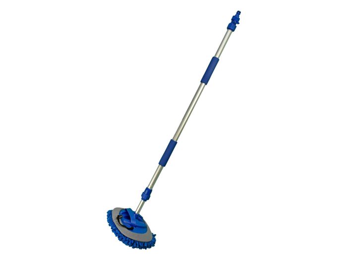 Microvezel wasborstel, bestaande uit een uitschuifbaar aluminium steel (90-168cm) met slang aansluiting, aan/uit schakelaar en een zachte microvezelwasborstel (ca. 27x20cm).